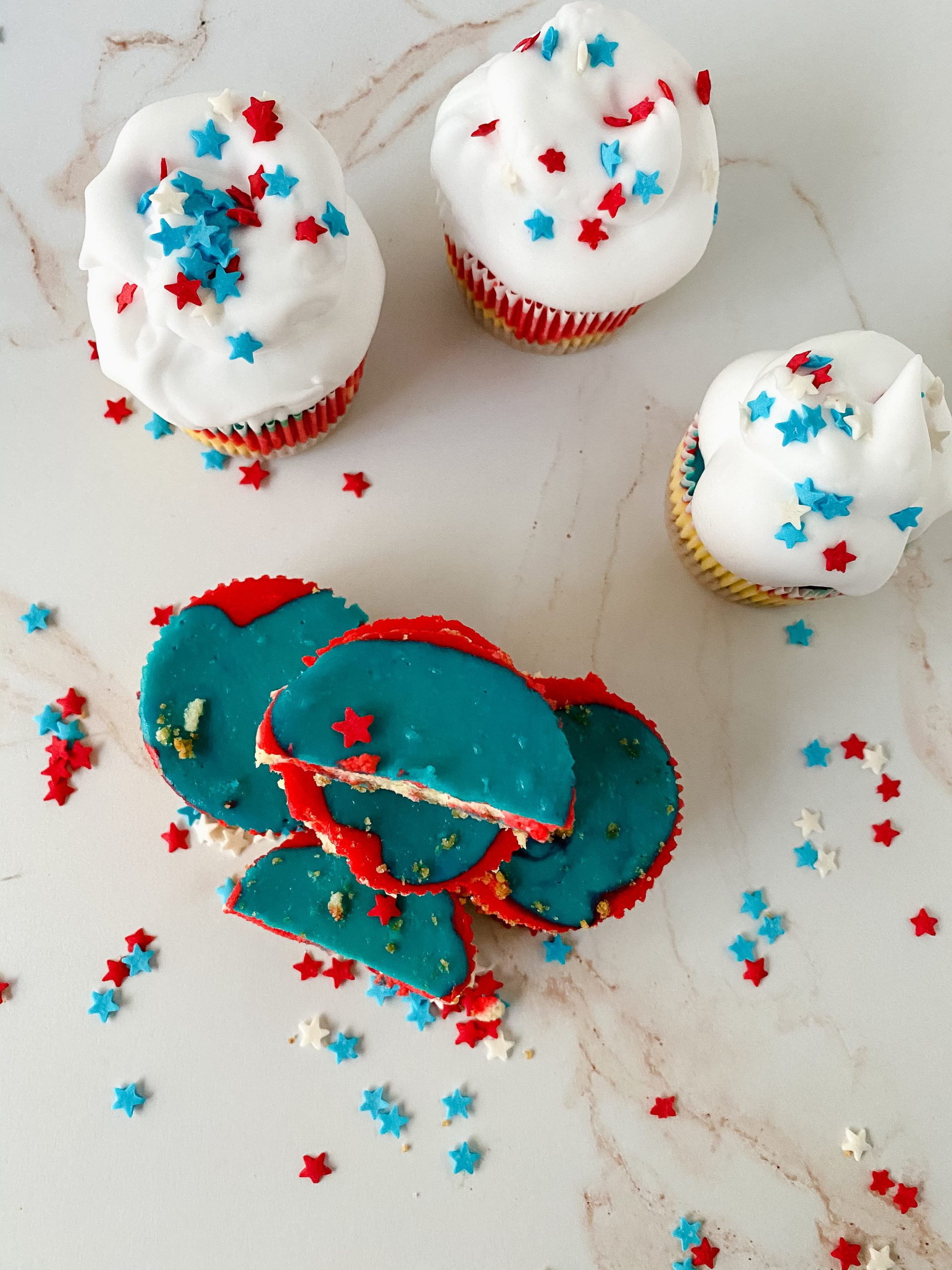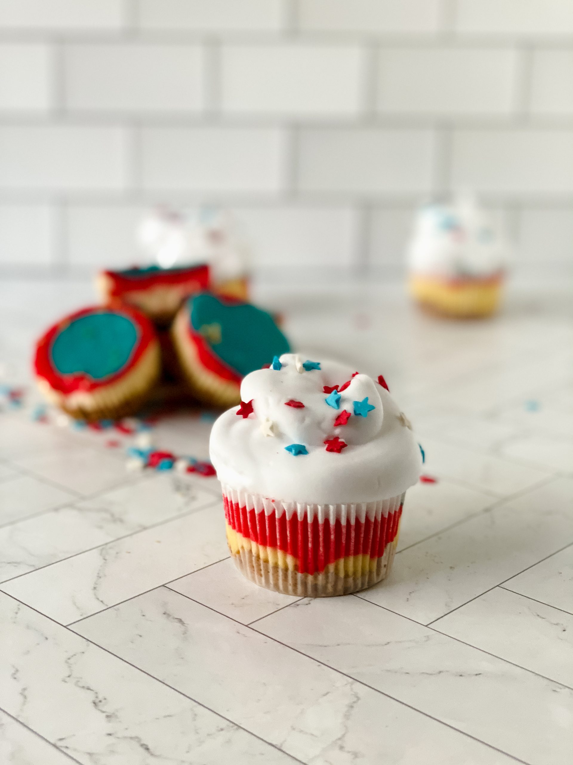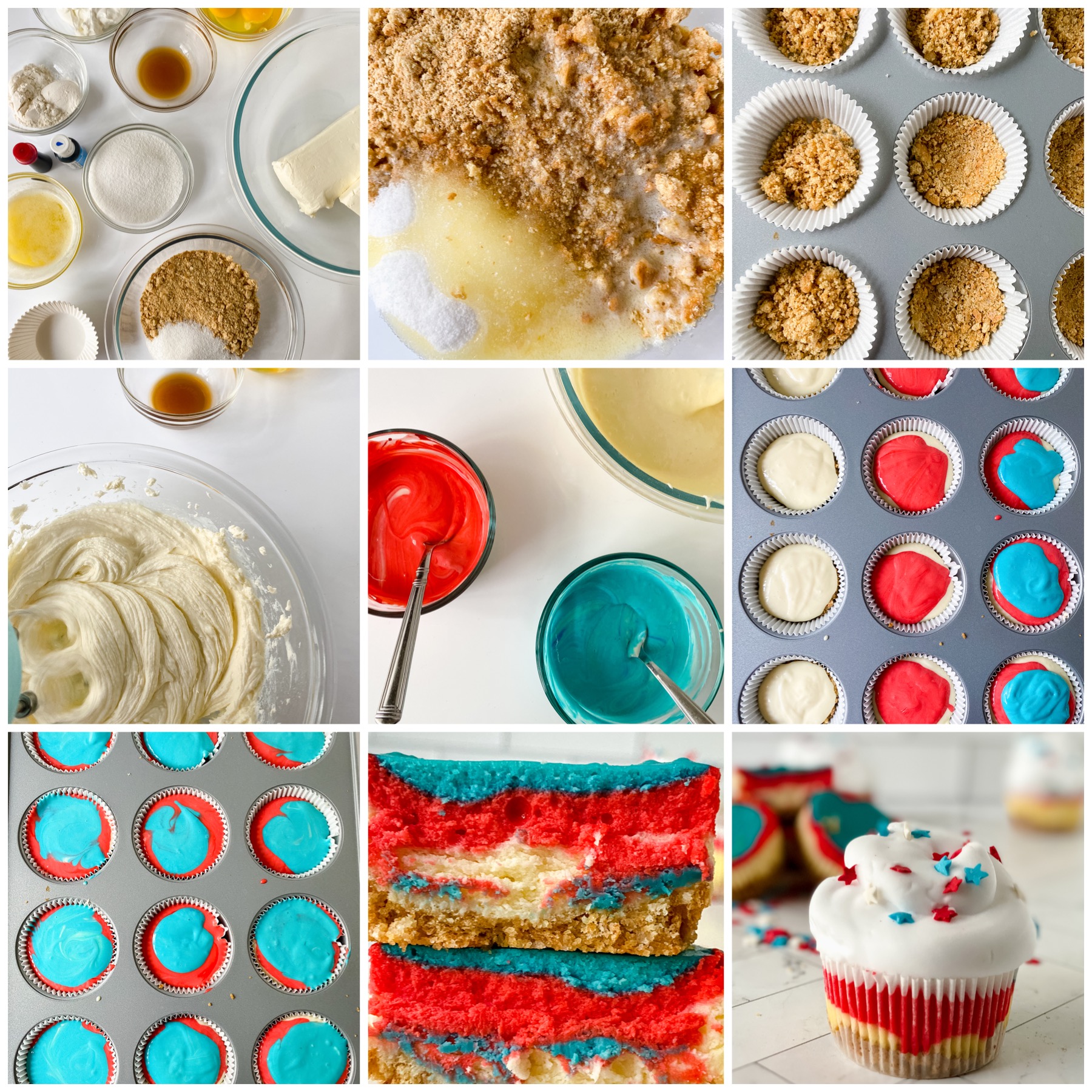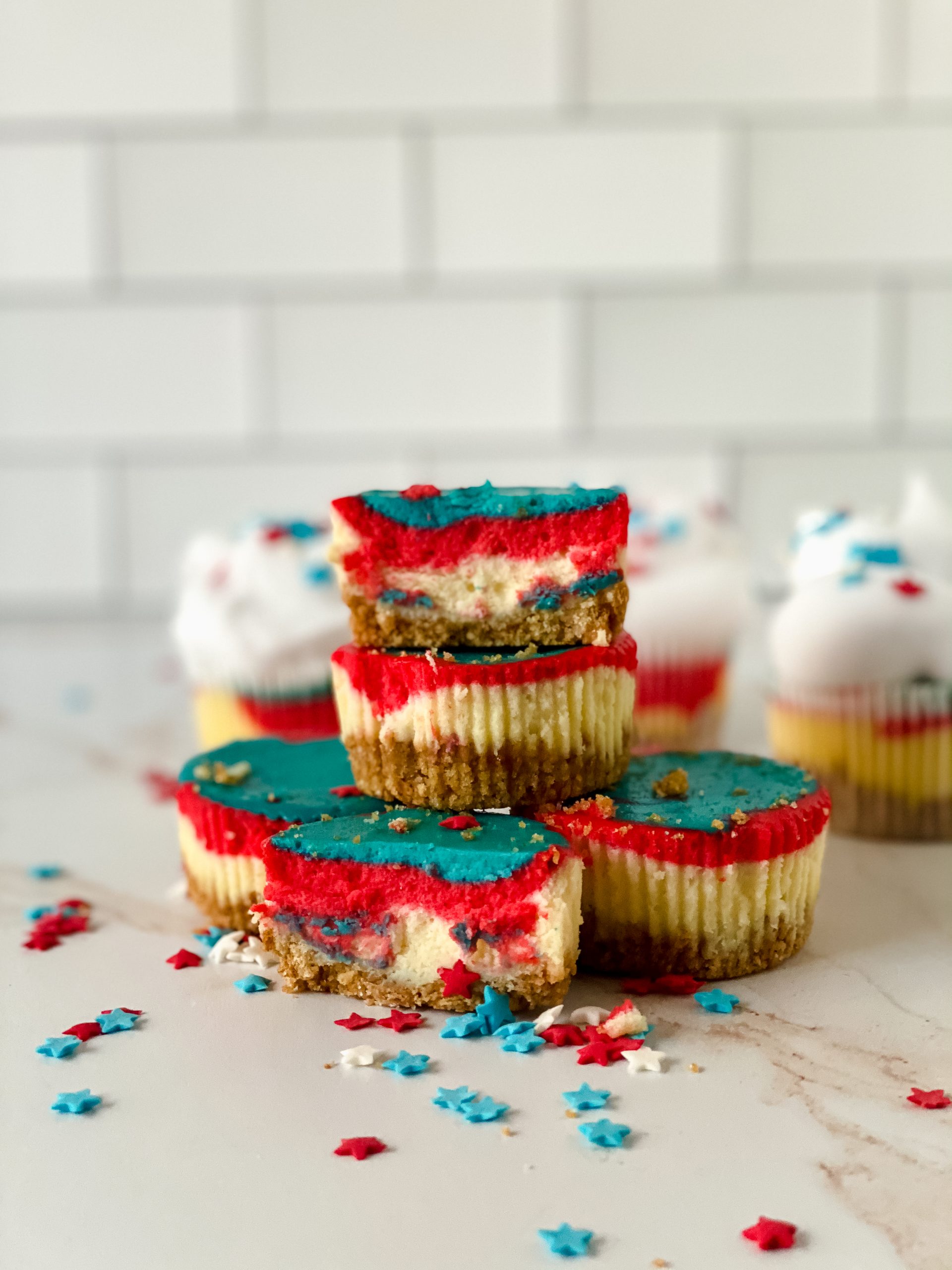 While I would follow the recipe exactly as written, you can substitute the colors! If you want to make this for Halloween, use orange and black. If you’re going to make this for Thanksgiving, use brown and gold. Thinking about whipping up these tasty mini cheesecakes for Christmas? Use red and green! You have so many endless color combinations, so don’t stop at just the traditional color pairings.