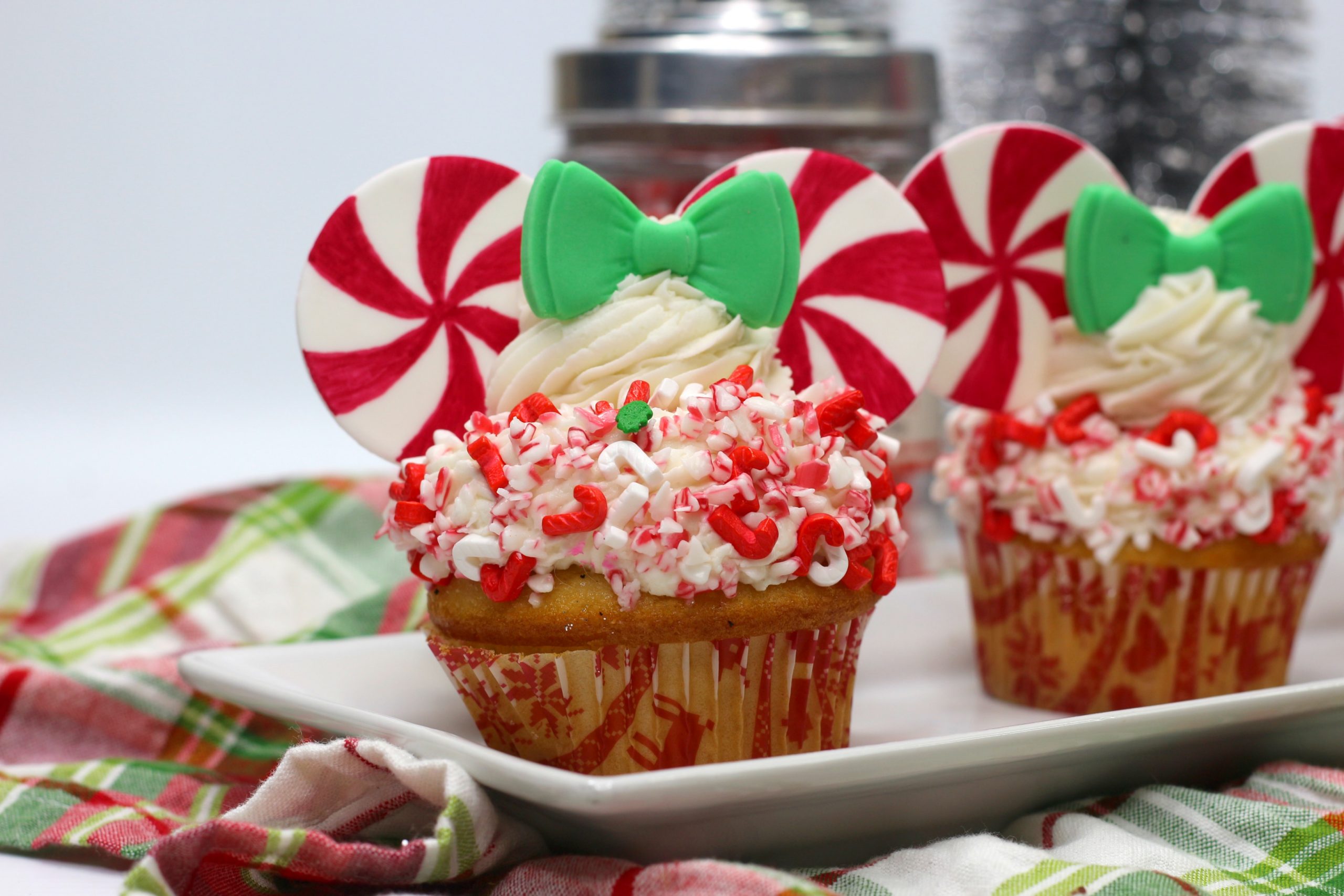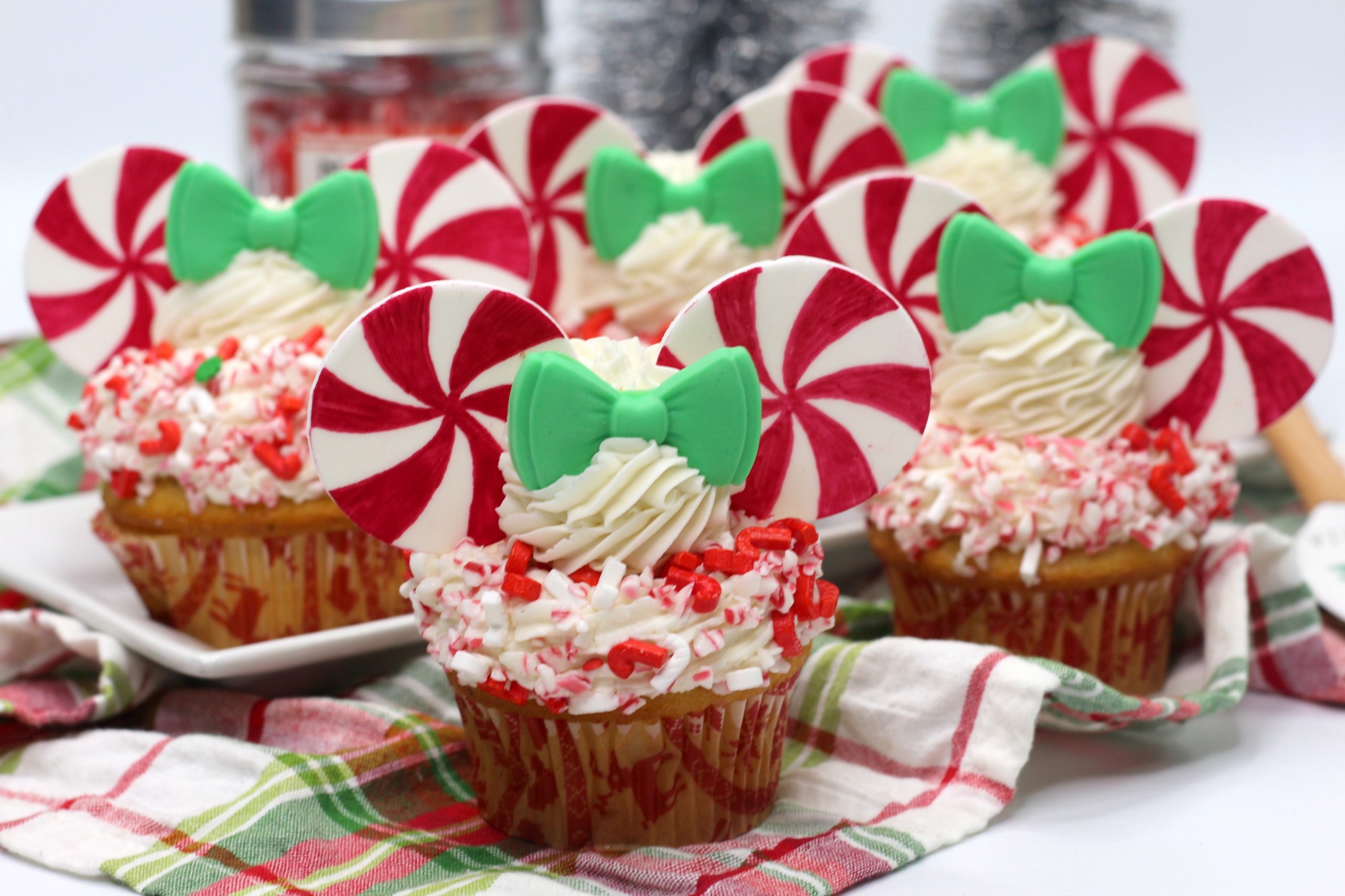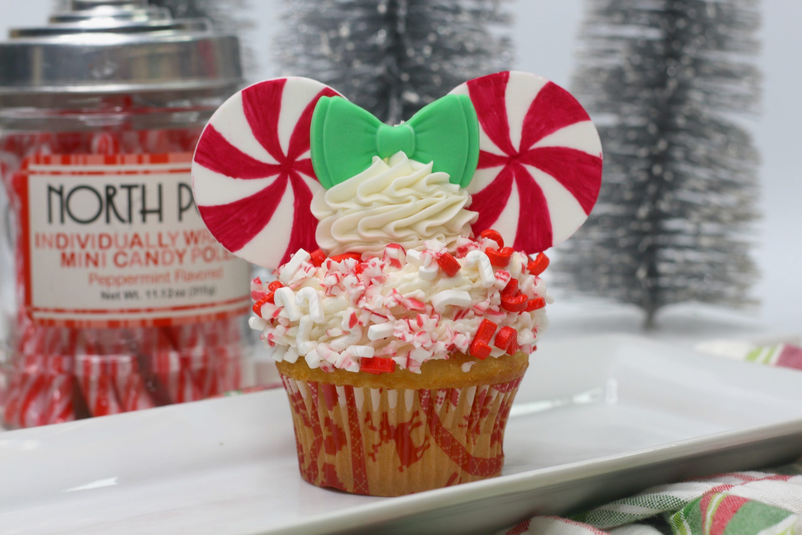 - Using the piping bag, pipe a thick wall of frosting around the edge of the cupcakes.Coat the frosting in the candy cane sprinkle mixture.Pipe a dollop of frosting into the middle.Carefully place a green bow in the center of the frosting.Carefully place two peppermint pinwheel “ears” on the sides of the bow.Enjoy!