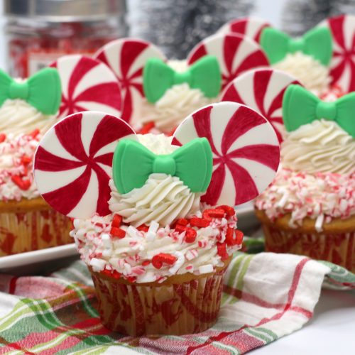 These easy to make vanilla cupcakes with scratch made peppermint frosting and fondant ears are SO good! You’ll love these Peppermint Pinwheel Minnie Mouse inspired cupcakes to whip up for your next treat. Perfect for easy desserts or afternoon snacks, these Peppermint Pinwheel Cupcakes are sure to be a hit!