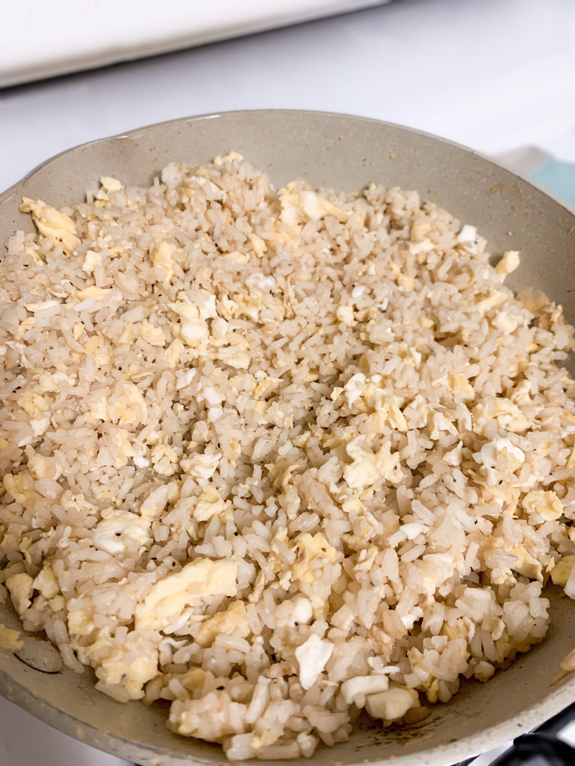 2. Once eggs are done, add cooked rice to pan & mix together. Bump heat down to medium. Season with salt, pepper, & ginger.