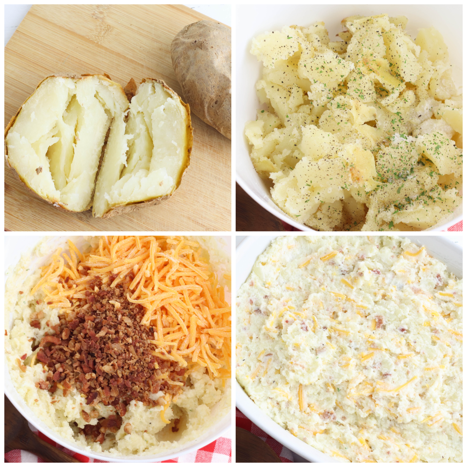 Making twice baked potato casserole is similar to making twice baked potatoes. That means you’ll need the same ingredients as you would if you were stuffing the potatoes with filling. To make this simple casserole, you’ll need: