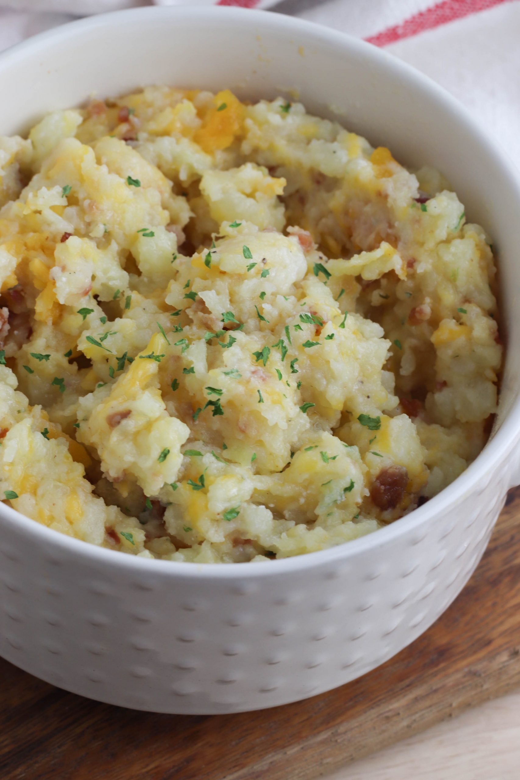 Add the heavy cream, salted butter, sour cream, salt, pepper, and parsley to the bowl with the potatoes. Use a hand mixer or potato masher to blend all the ingredients together until smooth. Stir in the cheddar cheese and chopped bacon until the filling is mixed well.